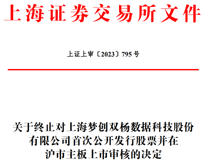 中国经济网北京12月13日讯 上交所网站昨日公布关于终止对上海梦创双杨数据科技股份有限公司(简称“梦创双杨”)首次公开发行股票并在沪市主板上市审核的决定。