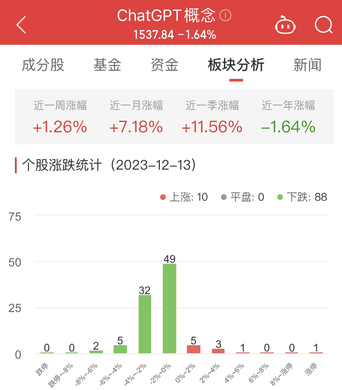 中国经济网北京12月13日讯 今日,ChatGPT概念板块整体涨幅-1.64%,其中10只股票上涨,0只股票平盘,88只股票下跌。