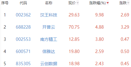 其中,汉王科技、开普云、南方精工、信雅达和云创数据位列板块涨幅前五位,涨幅分别为9.98%、4.88%、3.80%、2.59%和2.43%。