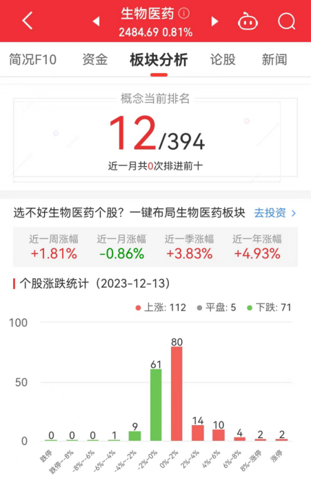 中国经济网北京12月13日讯 今日,生物医药板块整体涨幅0.81%,其中112只股票上涨,5只股票平盘,71只股票下跌。