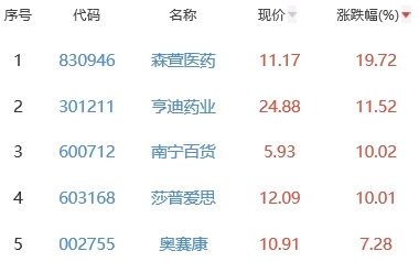 其中,森萱医药、亨迪药业、南宁百货、莎普爱思、奥赛康位列板块涨幅前五位,涨幅分别为19.72%、11.52%、10.02%、10.01%、7.28%。