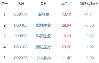 百奥泰、派林生物、科拓生物、润达医疗、永太科技位列涨幅榜后五位,涨幅分别为-4.11%、-3.53%、-3.27%、-2.92%、-2.90%。