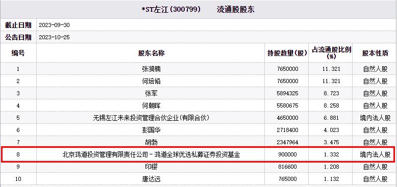 截至2023年9月30日,北京鸿道投资管理有限责任公司-鸿道全球优选私募证券投资基金持股数量为90万股,占流通股比例为1.332%,是*ST左江第8大流通股东。