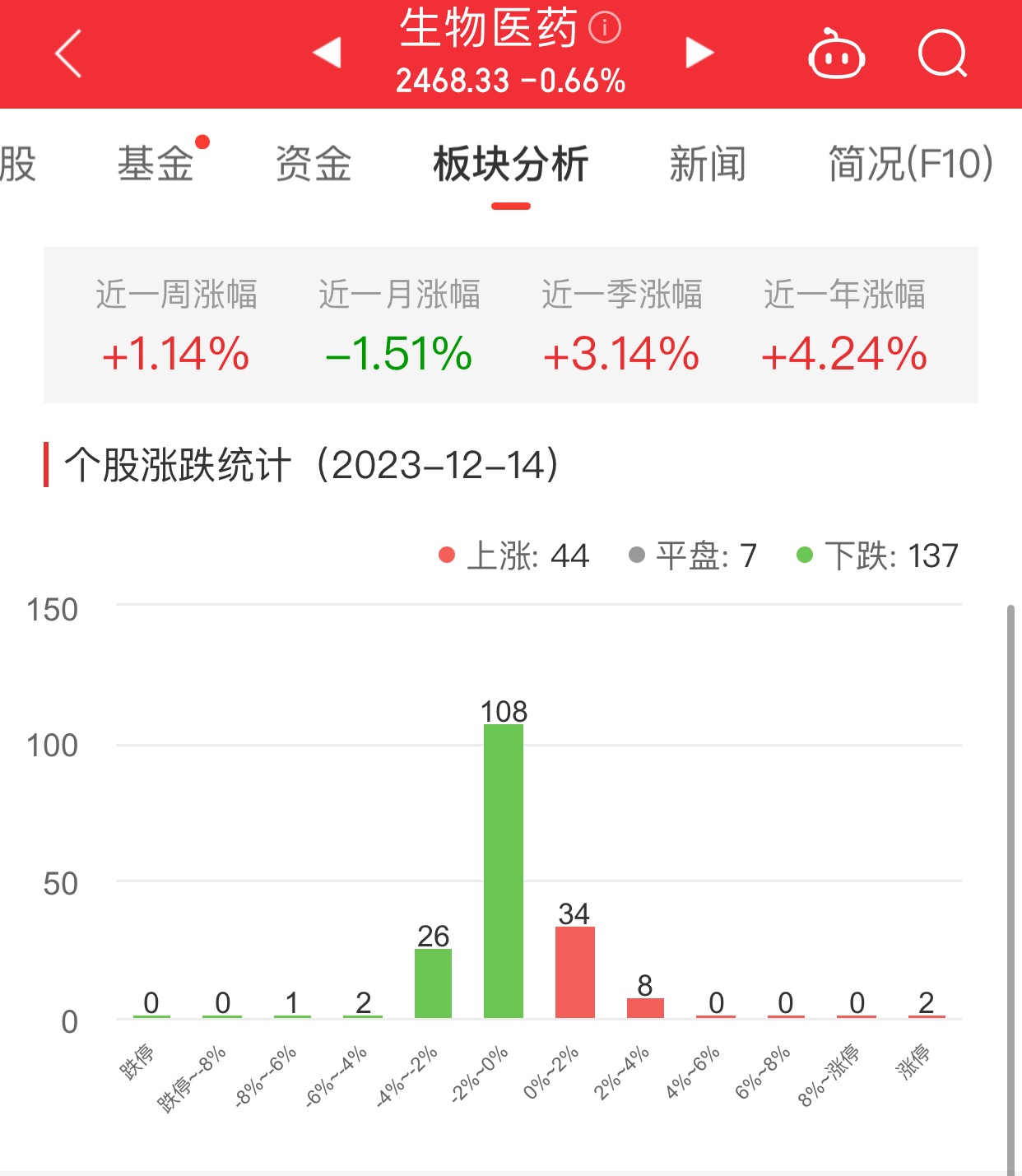 中国经济网北京12月14日讯 今日,生物医药板块整体涨幅-0.66%,其中44只股票上涨,7只股票平盘,137只股票下跌。