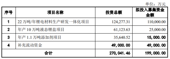 2023年9月13日,胜华新材发布向特定对象发行股票证券募集说明书(申报稿),本次向特定对象发行募集资金总额不超过199,000.00万元(含本数),扣除发行费用后的募集资金净额将用于以下项目:22万吨/年锂电材料生产研发一体化项目、年产10万吨液态锂盐项目、年产1.1万吨添加剂项目、补充流动资金。