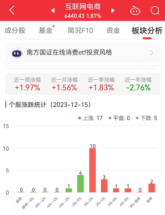 中国经济网北京12月15日讯 今日,互联网电商板块整体涨幅1.87%,其中,17只股票上涨,0只股票平盘,5只股票下跌。