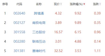 其中,跨境通、南极电商、三态股份、联络互动、赛维时代位列板块涨幅前五位,涨幅分别为9.92%、9.89%、6.15%、4.88%、3.53%。