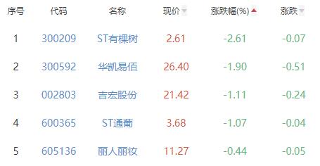 ST有棵树、华凯易佰、吉宏股份、ST通葡、丽人丽妆位列涨幅榜后五位,涨幅分别为-2.61%、-1.90%、-1.11%、-1.07%、-0.44%。