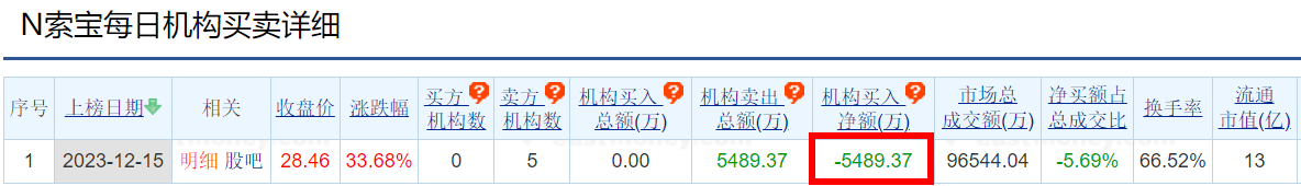 索宝蛋白龙虎榜:5家机构进卖出前5 净卖出5489万元