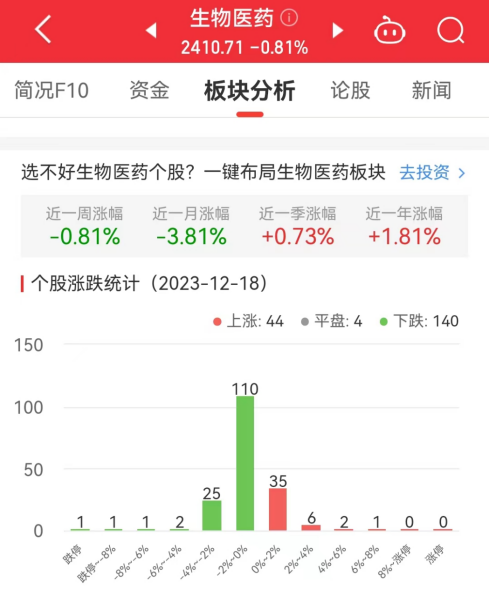 中国经济网北京12月18日讯 今日,生物医药板块整体涨幅-0.81%,其中44只股票上涨,4只股票平盘,140只股票下跌。