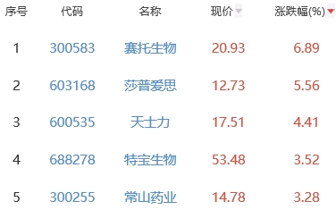其中,赛托生物、莎普爱思、天士力、特宝生物、常山药业位列板块涨幅前五位,涨幅分别为6.89%、5.56%、4.41%、3.52%、3.28%。