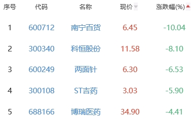 南宁百货、科恒股份、两面针、ST吉药、博瑞医药位列涨幅榜后五位,涨幅分别为-10.04%、-8.10%、-6.53%、-5.90%、-4.41%。