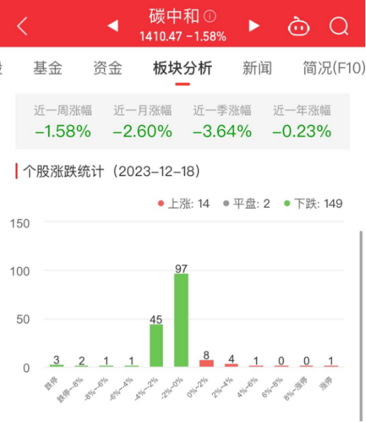 中国经济网北京12月18日讯 今日,碳中和板块整体跌幅1.58%,其中14只股票上涨,2只股票平盘,149只股票下跌。