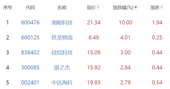 其中,湘邮科技、铁龙物流、硅烷科技、银之杰、中远海科位列板块涨幅榜前五位,涨幅分别为10.00%、4.01%、3.00%、2.84%、2.79%。