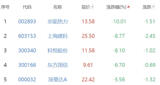 京能热力、上海建科、科恒股份、东方国信、深桑达A位列板块涨幅榜后五位,涨幅分别为-10.01%、-8.77%、-8.10%、-6.70%、-5.56%。