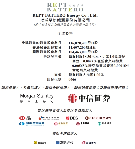 公告显示,瑞浦兰钧全球发售的发售股份数目为116,070,200股H股,其中香港发售股份数目为11,607,200股H股,国际发售股份数目为104,463,000股H股。