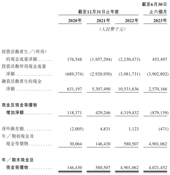 2020年、2021年、2022年及2023年1-6月,公司经营活动产生的现金流量净额分别为1.77亿元、-19.57亿元、-22.30亿元、4.53亿元,年末现金及现金等价物分别为1.46亿元、5.81亿元、49.01亿元、40.21亿元。