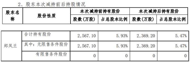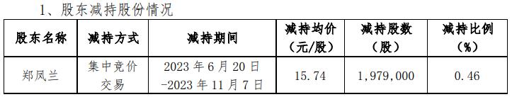 2023年6月20日-2023年11月7日,郑凤兰通过集中竞价交易减持股数1,979,000股,减持均价15.74元/股,减持比例0.46%。经计算,郑凤兰减持总金额为31149460元。