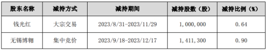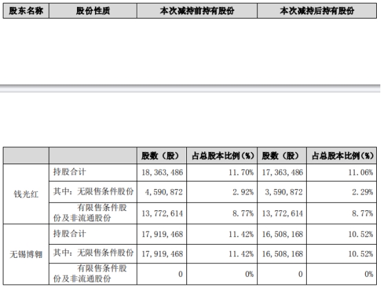 本次减持前,钱光红持有股份18,363,486股,占总股本比例11.70%;无锡博翱持有股份17,919,468股,占总股本比例11.42%。本次减持后,钱光红持有股份17,363,486股,占总股本比例11.06%;无锡博翱持有股份16,508,168股,占总股本比例10.52%。