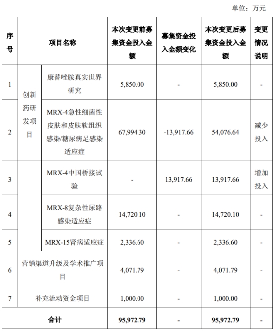 MRX-4中国桥接试验项目实施可加速新产品研发,满足更多临床治疗用药需求、增强公司核心技术优势,巩固并提高核心竞争力。本次变更后,公司首次公开发行募集资金的募投项目情况如下: