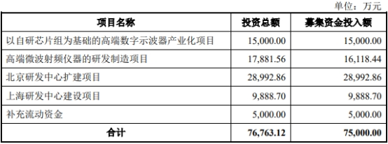 普源精电本次发行募集资金总额18.46亿元,扣除发行费用后,募集资金净额16.66亿元。普源精电最终募集资金净额比原计划多9.16亿元。公司于2022年4月1日披露的招股说明书显示,普源精电拟募集资金7.50亿元,分别用于以自研芯片组为基础的高端数字示波器产业化项目、高端微波射频仪器的研发制造项目、北京研发中心扩建项目、上海研发中心建设项目、补充流动资金。