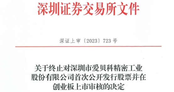 深交所于2023年6月28日依法受理了爱贝科首次公开发行股票并在创业板上市的申请文件,并依法依规进行了审核。2023年12月22日,爱贝科向深交所提交了《深圳市爱贝科精密工业股份有限公司关于撤回首次公开发行股票并在创业板上市申请文件的申请》,保荐人向深交所提交了《国信证券股份有限公司关于撤销保荐深圳市爱贝科精密工业股份有限公司首次公开发行股票并在创业板上市的申请》。根据《深圳证券交易所股票发行上市审核规则》第六十二条的有关规定,深交所决定终止对爱贝科首次公开发行股票并在创业板上市的审核。