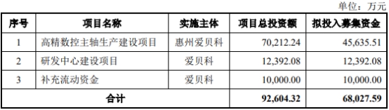 爱贝科原拟在深交所创业板发行新股不超过1,674.00万股,占本次发行后总股本不低于25%。公司原拟募集资金68,027.59万元,分别用于高精数控主轴生产建设项目、研发中心建设项目、补充流动资金。