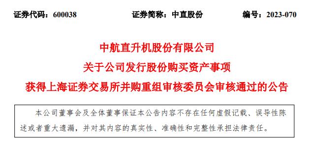 中国经济网北京12月26日讯 中航直升机股份有限公司(简称“中直股份”,600038.SH)昨晚发布关于公司发行股份购买资产事项获得上海证券交易所并购重组审核委员会审核通过的公告。