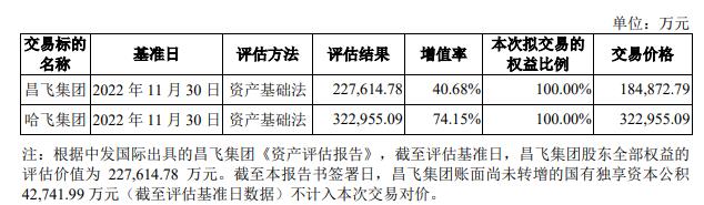 截至评估基准日,本次交易标的资产哈飞集团100%股权的评估值为322,955.09万元。各方一致同意,以上述评估值为参考依据,将本次交易标的资产哈飞集团100%股权的交易作价确定为322,955.09万元。