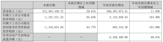 2023年前三季度,公司实现营业收入5.60亿元,同比增长11.82%;实现归属于上市公司股东的净利润213.26万元,同比增长104.30%;实现归属于上市公司股东的扣除非经常性损益的净利润90.33万元,同比增长101.69%;经营活动产生的现金流量净额为-235.04万元。