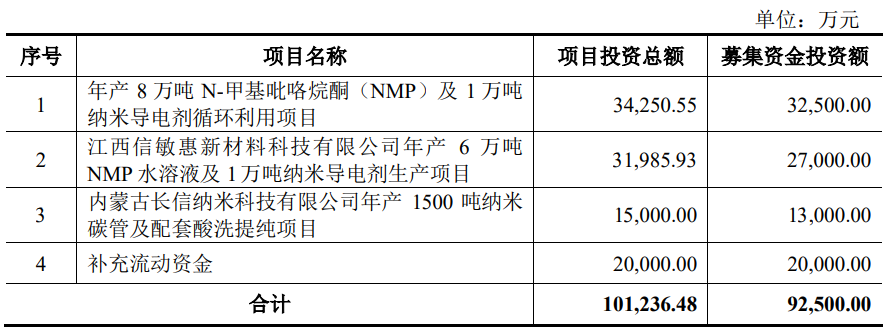 长信化学原拟在上交所主板发行不超过26,710,334股,占发行后总股本比例不低于25%,均为公开发行新股。公司拟募集资金92,500.00万元,用于年产8万吨N-甲基吡咯烷酮(NMP)及1万吨纳米导电剂循环利用项目、江西信敏惠新材料科技有限公司年产6万吨NMP水溶液及1万吨纳米导电剂生产项目、内蒙古长信纳米科技有限公司年产1500吨纳米碳管及配套酸洗提纯项目、补充流动资金。