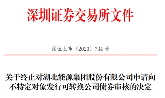 2023年12月26日,湖北能源和保荐人华泰联合证券有限责任公司、长江证券承销保荐有限公司向深交所提交了《湖北能源集团股份有限公司关于撤回向不特定对象发行可转换公司债券的申请》和《华泰联合证券有限责任公司关于撤回湖北能源集团股份有限公司向不特定对象发行可转换公司债券的申请》《长江证券承销保荐有限公司关于撤回湖北能源集团股份有限公司向不特定对象发行可转换公司债券的申请》,申请撤回申请文件。根据《深圳证券交易所上市公司证券发行上市审核规则》第二十条、《深圳证券交易所股票发行上市审核规则》第六十二条的有关规定,深交所决定终止对湖北能源申请向不特定对象发行可转换公司债券的审核。