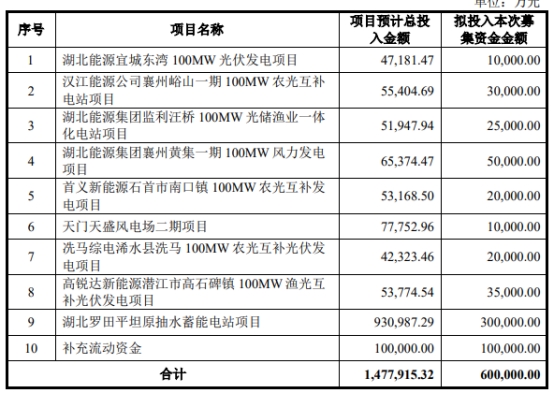 湖北能源于2023年9月14日披露关于向不特定对象发行可转换公司债券募集说明书(申报稿),公司本次原拟发行的可转债所募集资金总额不超过600,000.00万元(含),扣除发行费用后将全部用于湖北能源宜城东湾100MW光伏发电项目、汉江能源公司襄州峪山一期100MW农光互补电站项目、湖北能源集团监利汪桥100MW光储渔业一体化电站项目、湖北能源集团襄州黄集一期100MW风力发电项目、首义新能源石首市南口镇100MW农光互补发电项目、天门天盛风电场二期项目、洗马综电浠水县洗马100MW农光互补光伏发电项目、高锐达新能源潜江市高石碑镇100MW渔光互补光伏发电项目、湖北罗田平坦原抽水蓄能电站项目、补充流动资金。