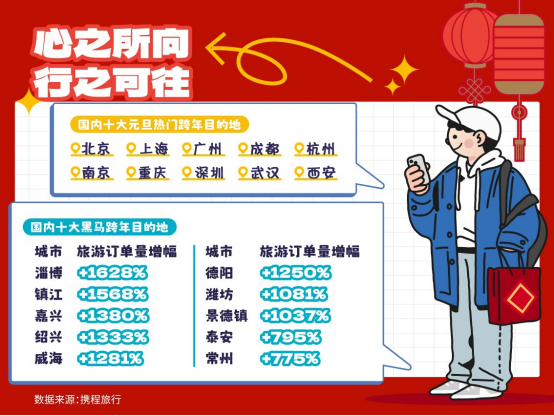 此外,景美人少的小众目的地热度依旧,元旦跨年黑马目的地前十分别是:淄博(增长1628%)镇江(增长1568%)嘉兴(1380%)绍兴(1333%)威海(1281%)德阳(1250%)潍坊(1081%)景德镇(1037%)泰安(795%)常州(775%)。