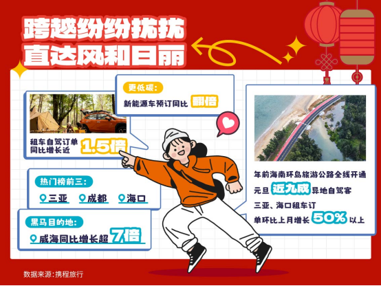 其中,三亚、成都、海口位列元旦自驾旅游城市热门榜前三,而威海成为今年元旦旅游的黑马目的地,订单量同比增长超7倍。元旦自驾出行以家庭、朋友同行为主,在车型选择上,商务车和SUV车型更受青睐。同时,更受年轻人喜爱的新能源车的预订量较去年呈现翻倍增长特征。