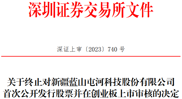 2023年12月22日,蓝山屯河向深交所提交了《新疆蓝山屯河科技股份有限公司关于撤回首次公开发行股票并在创业板上市申请文件的申请》,保荐人向深交所提交了《中国银河证券股份有限公司关于撤回新疆蓝山屯河科技股份有限公司首次公开发行股票并在创业板上市申请文件的请示》。根据《深圳证券交易所股票发行上市审核规则》第六十二条的有关规定,深交所决定终止对蓝山屯河首次公开发行股票并在创业板上市的审核。