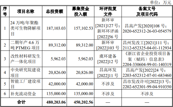 蓝山屯河原拟在深交所创业板公开发行股票合计数量为不超过16,482.33万股,占发行后总股本的比例不低于10%。蓝山屯河原拟募集资金450,202.56万元,分别用于24万吨/年聚酯类可生物降解项目、二期年产4.6万吨PTMEG项目、改性材料研发生产一体化项目、中央研究院建设项目、智能工厂建设项目和补充流动资金。