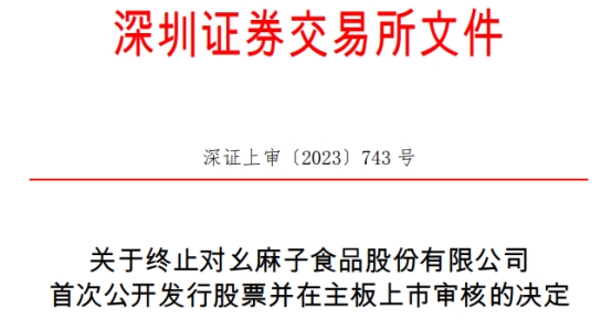 深交所于2023年3月3日依法受理了幺麻子首次公开发行股票并在主板上市的申请文件,并依法依规进行了审核。2023年12月27日,幺麻子向深交所提交了《幺麻子食品股份有限公司关于撤回首次公开发行股票并在主板上市申请文件的申请》,保荐人向深交所提交了《中国国际金融股份有限公司关于撤回幺麻子食品股份有限公司首次公开发行股票并在主板上市申请文件的申请》。根据《深圳证券交易所股票发行上市审核规则》第六十二条的有关规定,深交所决定终止对幺麻子首次公开发行股票并在主板上市的审核。