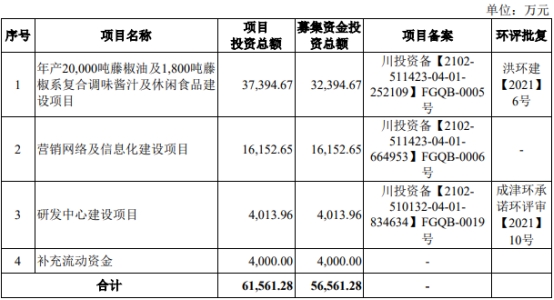 赵跃军原拟在深交所主板公开发行股票不超过4,400万股,占发行后总股本的比例不低于25%。公司原拟募集资金56,561.28万元,分别用于年产20,000吨藤椒油及1,800吨藤椒系复合调味酱汁及休闲食品建设项目、营销网络及信息化建设项目、研发中心建设项目、补充流动资金。