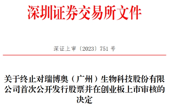 2023年12月29日,瑞博奥向深交所提交了《瑞博奥(广州)生物科技股份有限公司关于撤回首次公开发行股票并在创业板上市申请文件的申请》(〔2023〕第7号),保荐人向深交所提交了《中信证券股份有限公司关于撤销保荐瑞博奥(广州)生物科技股份有限公司首次公开发行股票并在创业板上市的申请》(中信证券(2023)2285号)。根据《深圳证券交易所股票发行上市审核规则》第六十二条的有关规定,深交所决定终止对瑞博奥首次公开发行股票并在创业板上市的审核。