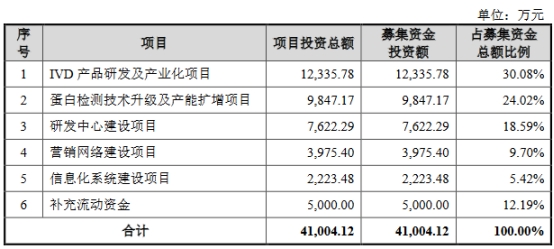 瑞博奥原拟在深交所创业板公开发行股票总数不超过2,400万股,且发行股票数量占公司发行后总股本的比例不低于25%。公司原拟募集资金41,004.12万元,用于IVD产品研发及产业化项目、蛋白检测技术升级及产能扩增项目、研发中心建设项目、营销网络建设项目、信息化系统建设项目、补充流动资金。