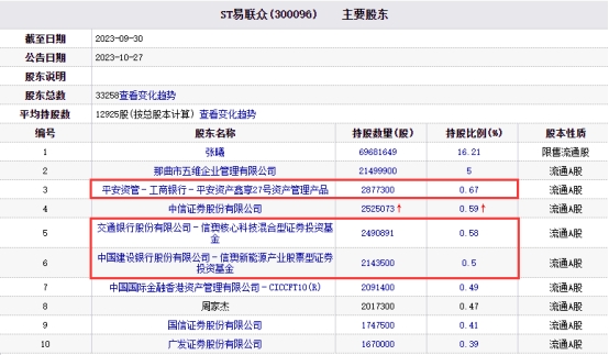 公开资料显示,截至2023年9月30日,ST易联众前十大股东中,平安资管-工商银行-平安资产鑫享27号资产管理产品位列第三大股东,持股数量为2877300股,持股比例0.67%;第五、第六大股东分别为交通银行股份有限公司-信澳核心科技混合型证券投资基金持股数量为2490891股,持股比例0.58%;中国建设银行股份有限公司-信澳新能源产业股票型证券投资基金持股数量为2143500股,持股比例0.50%