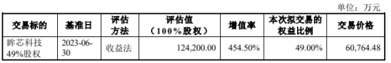 本次交易最终采取收益法评估结果作为评估结论,眸芯科技截至2023年6月30日股东全部权益的账面值为22,398.36万元,评估值124,200.00万元,评估增值101,801.64万元,增值率454.50%。经交易各方参考评估值协商确定,标的资产即眸芯科技49.00%股权的交易价格为60,764.48万元,对应100%股权作价为124,000万元。