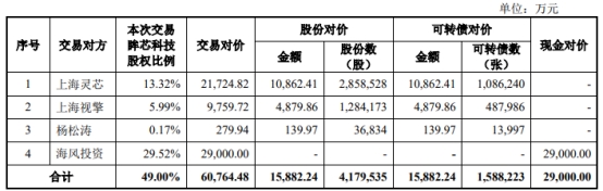 本次交易中海风投资将获得现金对价29,000.00万元。上海灵芯、上海视擎和杨松涛通过本次交易取得的上市公司股份/可转债自本次发行结束之日起12个月内不得转让。