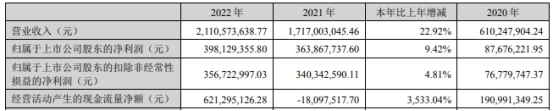2022年,富瀚微实现营业收入21.11亿元,同比增长22.92%;归属于上市公司股东的净利润为3.98亿元,同比增长9.42%;归属于上市公司股东的扣除非经常性损益的净利润为3.57亿元,同比增长4.81%;经营活动产生的现金流量净额为6.21亿元,上年同期为-1809.75万元。
