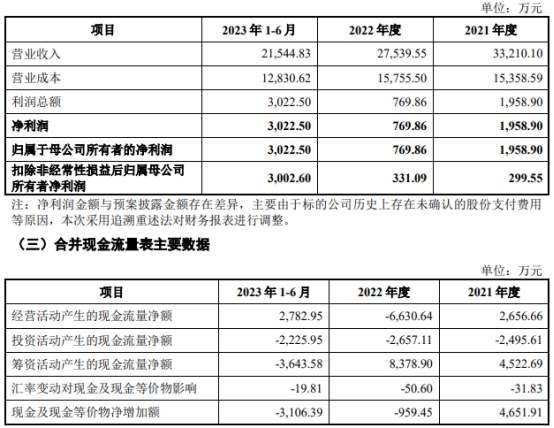 2021年、2022年及2023年1-6月,标的公司即眸芯科技收入分别为33,210.10万元、27,539.55万元和21,544.83万元,归属于母公司净利润分别为1,958.90万元、769.86万元和3,022.50万元,扣除非经常性损益后归属母公司所有者净利润分别为299.55万元、331.09万元和3,002.60万元,经营活动产生的现金流量净额分别为2,656.66万元、-6,630.64万元和2,782.95万元,毛利率分别为53.75%、42.79%和40.45%。