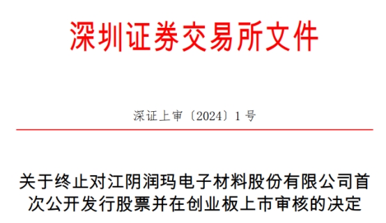 中国经济网北京1月3日讯 深交所网站昨日公布关于终止对江阴润玛电子材料股份有限公司(以下简称“润玛股份”)首次公开发行股票并在创业板上市审核的决定。