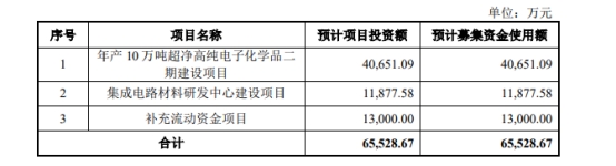 润玛股份原拟在深交所创业板公开发行股票的总量不超过2,100.00万股,原拟募集资金65,528.67万元,计划用于年产10万吨超净高纯电子化学品二期建设项目、集成电路材料研发中心建设项目、补充流动资金项目。