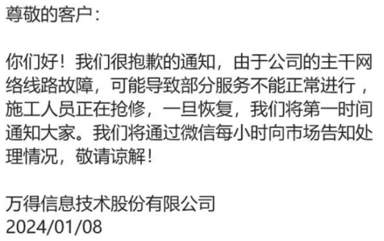 万得方面回应称,由于公司的主干网络线路故障,可能导致部分服务不能正常进行,施工人员正在抢修,一旦恢复,将第一时间通知客户,并将通过微信每小时向市场告知处理情况。