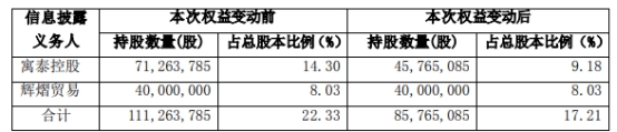 本次权益变动前,寓泰控股持有公司71,263,785股,占总股本比例14.30%;本次权益变动后,寓泰控股持有公司45,765,085股,占总股本比例9.18%;本次权益变动前,寓泰控股及其一致行动人辉熠贸易合计持有公司111,263,785股,占总股本比例22.33%;本次权益变动后,寓泰控股及其一致行动人辉熠贸易合计持有公司85,765,085股,占总股本比例17.21%。